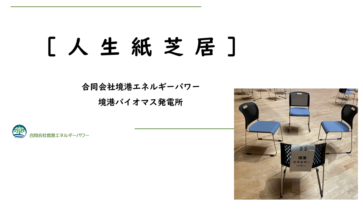 1月29日、境港市立第一中学校が主催の「みなトーク」がみなとテラスで開催され、参加しました。 「みなトーク」では、中学生が小グループに分かれて、境港市で特色のある取組を行っている事業所の社会人と対話することで、自分たちのキャリア形成や境港市についての思いを新たにするきっかけを創出するのが目的です。 当社は、将来を担う中学生の憧れる存在となり少しでも力になれるよう、バイオマス発電の事業を通じて脱炭素社会の実現に向け、安全を最優先に事業を推進し地域に貢献してまいりますので、皆さまにはご理解を賜りますようお願い申し上げます。